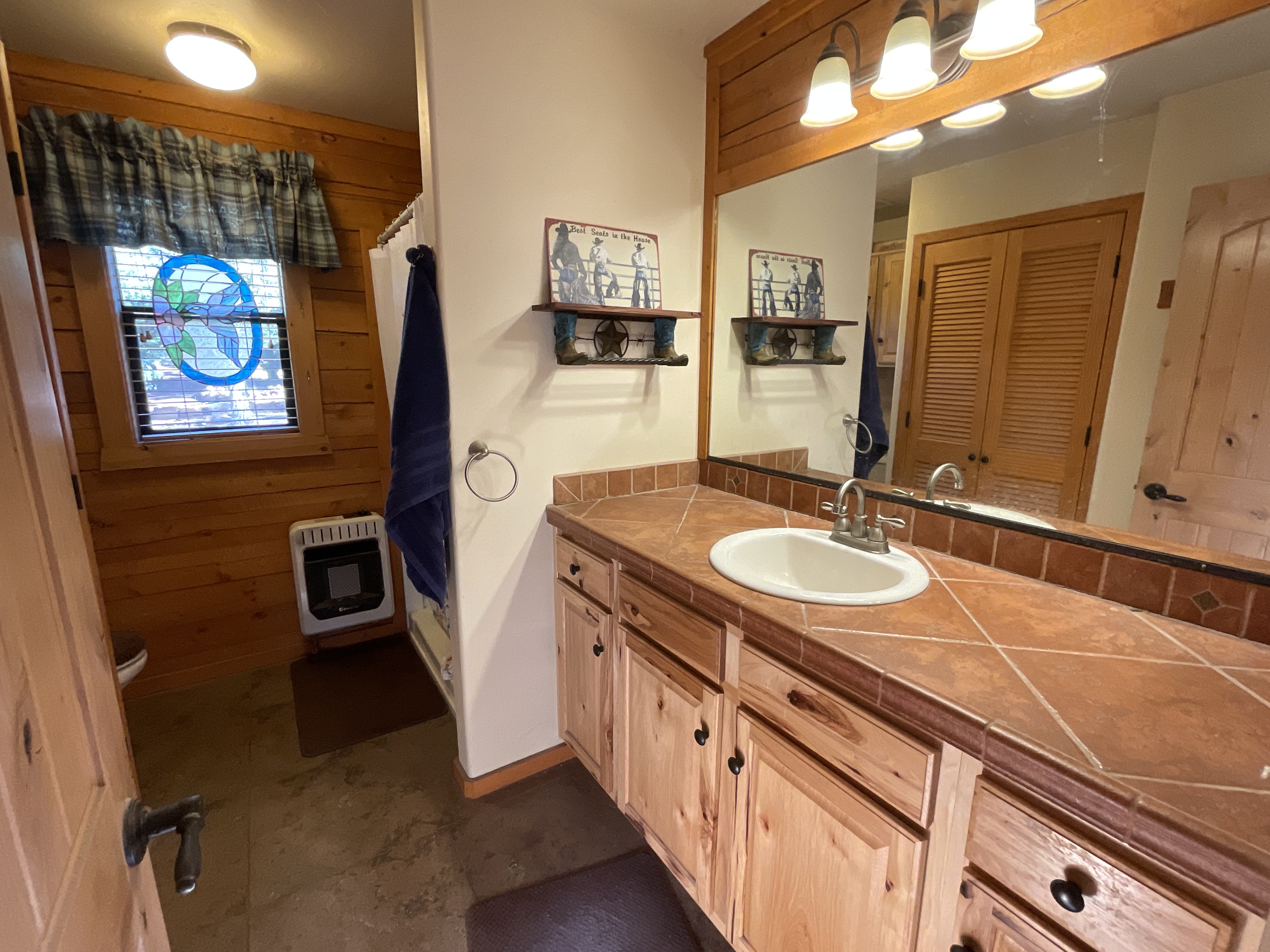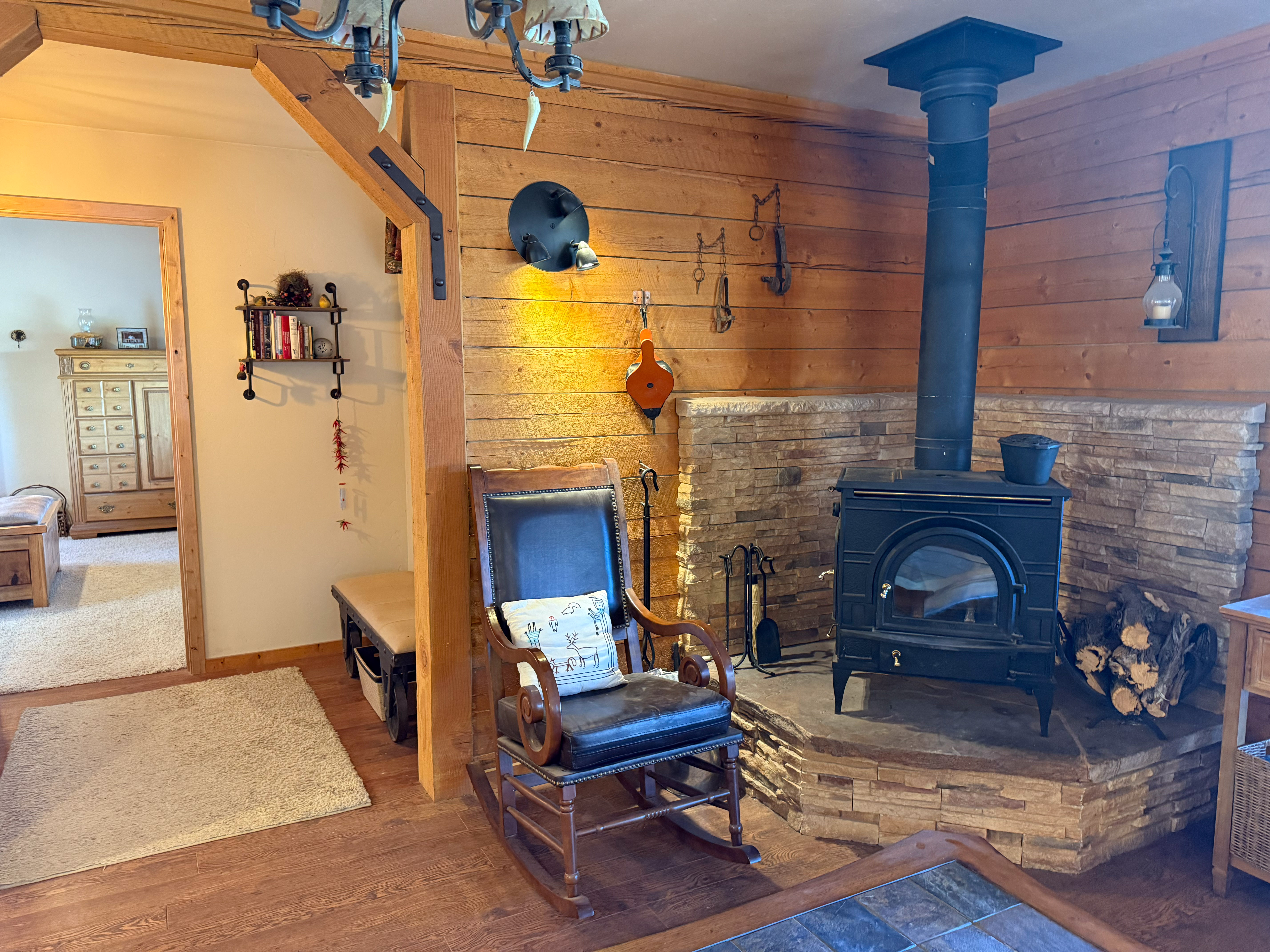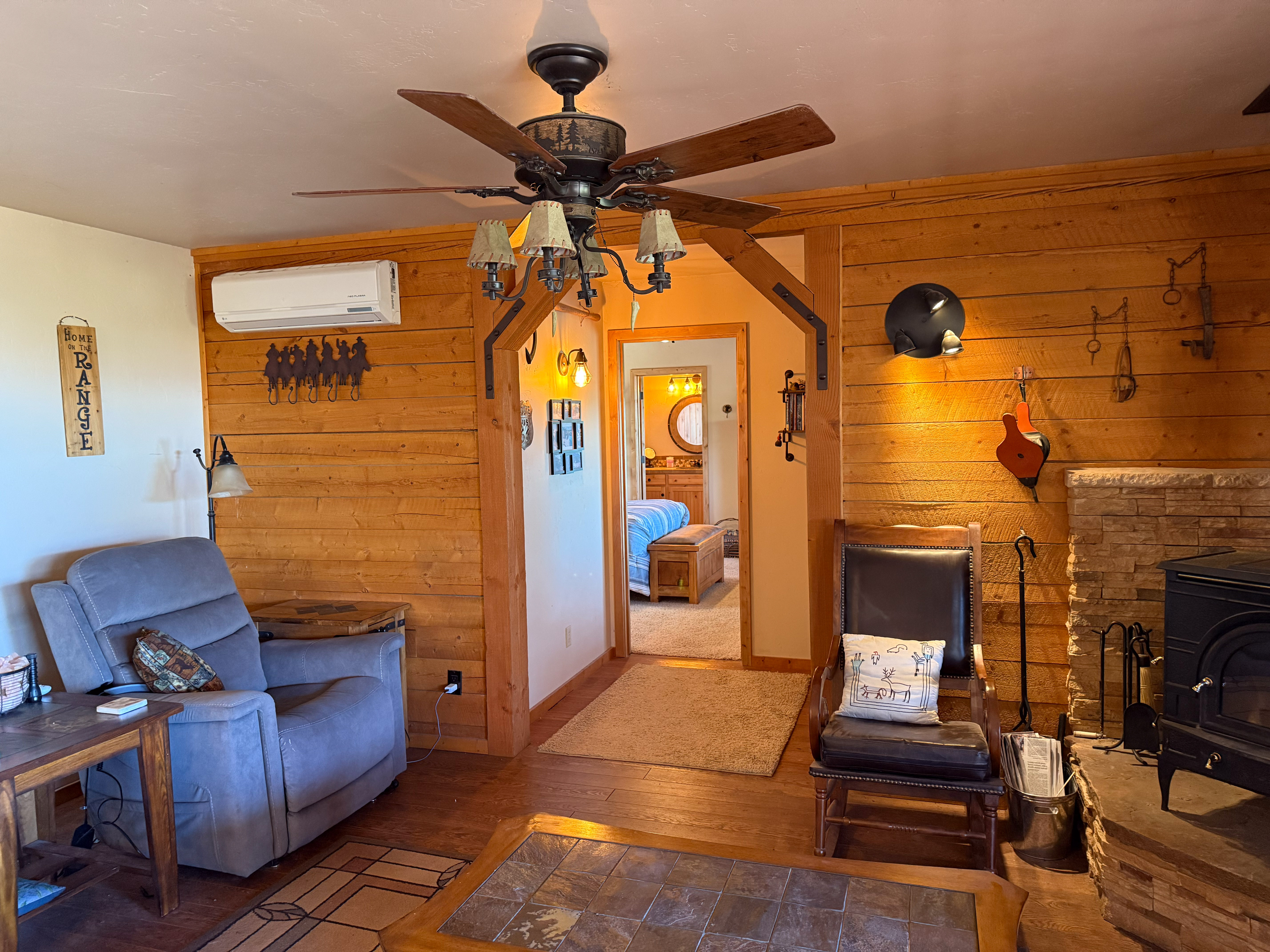 Step inside to an inviting open floor plan featuring two bedrooms, two baths, and a comfortable kitchen/dining and living area centered around a cozy wood-burning stove. The home showcases solid wood core doors, custom kitchen cabinetry, and ample storage including a pantry, linen closet, and walk-in closet in the primary bedroom. Both bathrooms feature walk-in showers, and comfort is ensured with propane heaters throughout plus a mini-split system for additional temperature control—though at this ideal elevation, air conditioning is seldom needed.
