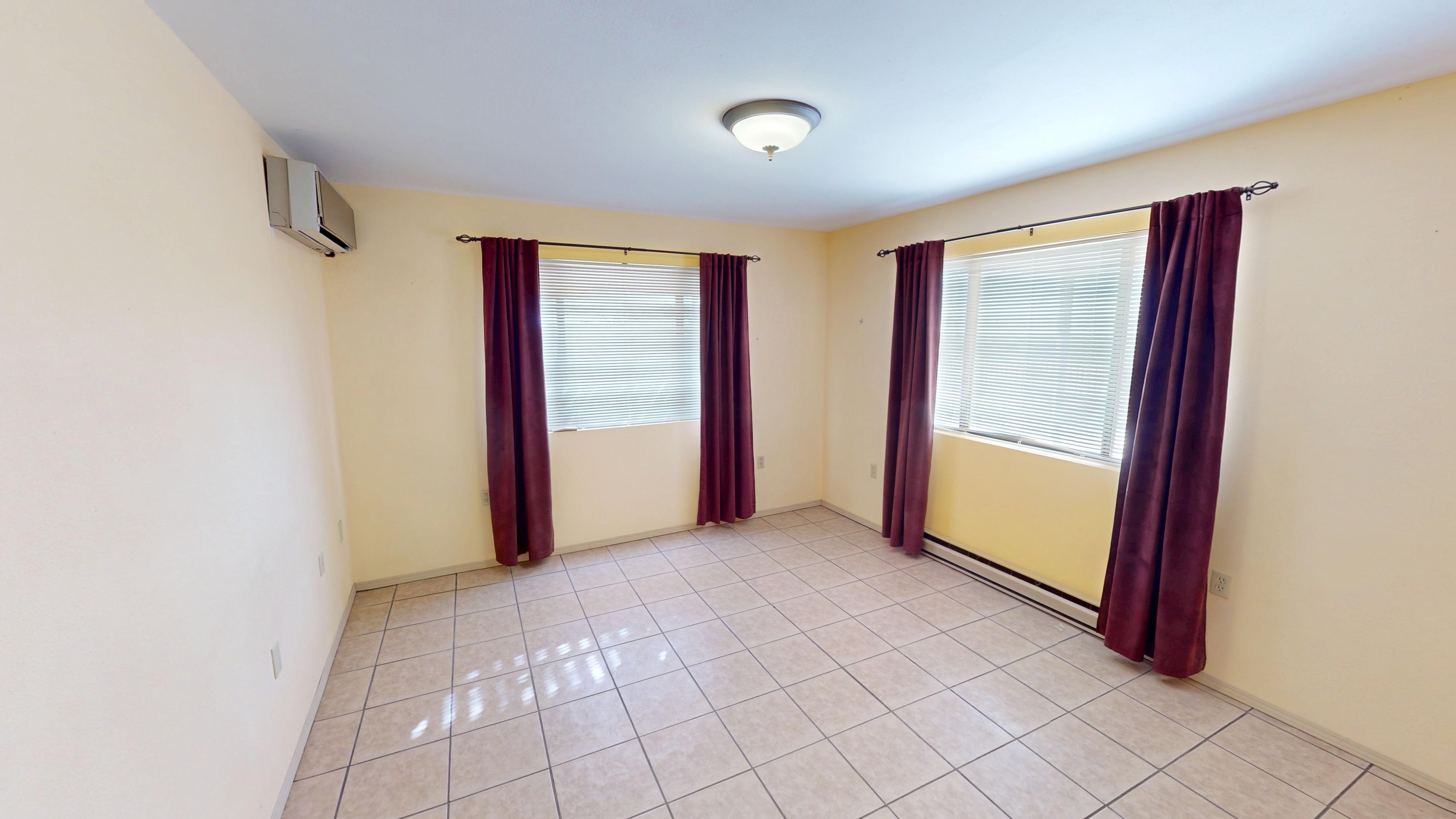 The kitchen is equipped with a built-in range, ample counter space, and generous cabinetry opening to the living room. Each bedroom has its own mini-split system for personalized comfort, with the primary bedroom also featuring a private ¾ bath.