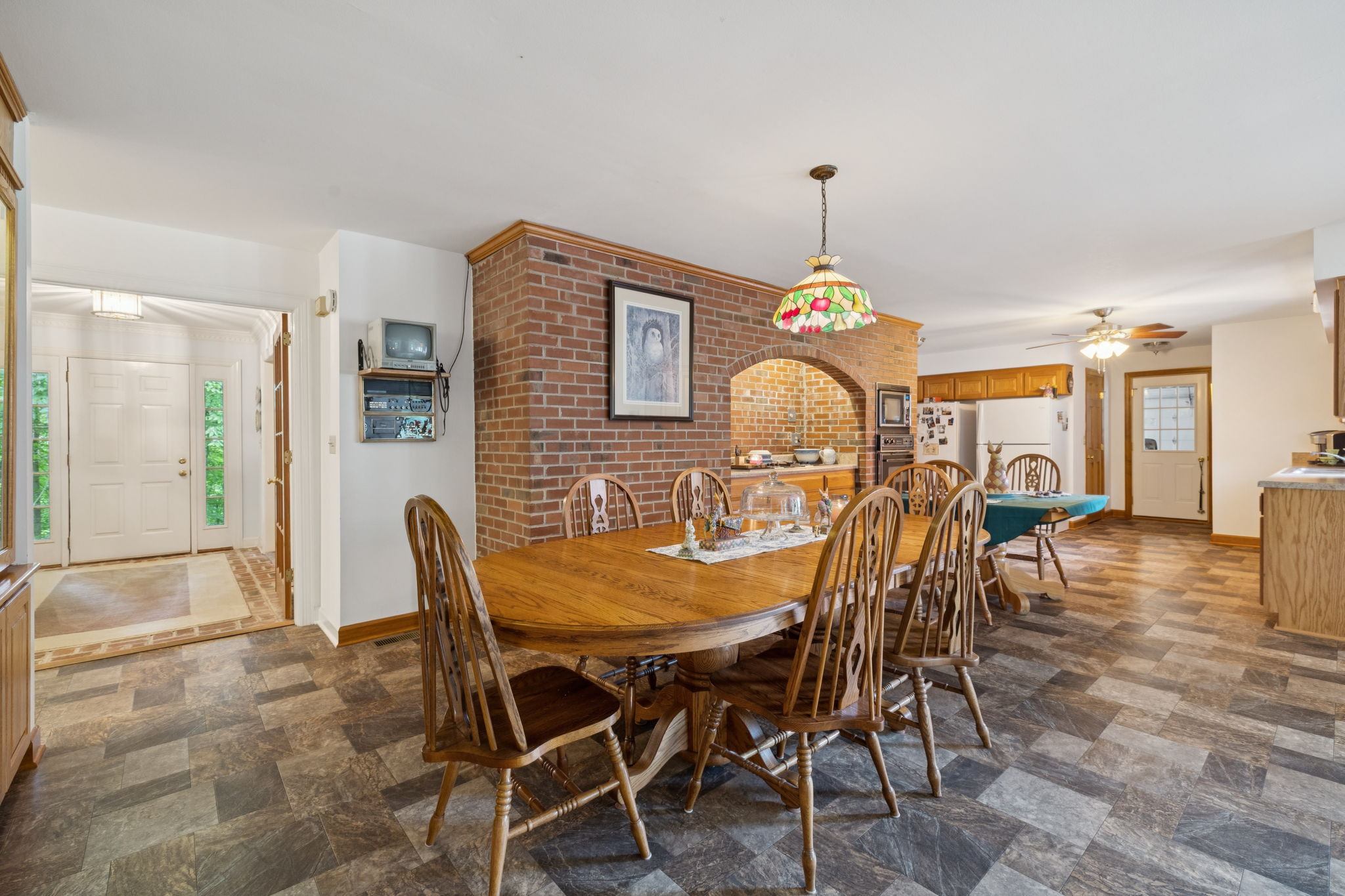 The formal foyer welcomes guests with brick inlay flooring and elegant Greek key crown molding. French doors open from the foyer into the kitchen, an architecturally striking space anchored by a rare recessed brick alcove housing the original vintage Jenn-Air modular cooktop with grill and coil elements. Surrounding this centerpiece are solid oak cabinets, a walk-in pantry, and a conveniently placed half bath. The kitchen functions as the true hub of the home, connecting seamlessly to the garage, sunroom, oak library, back patio, and the expansive great room.
