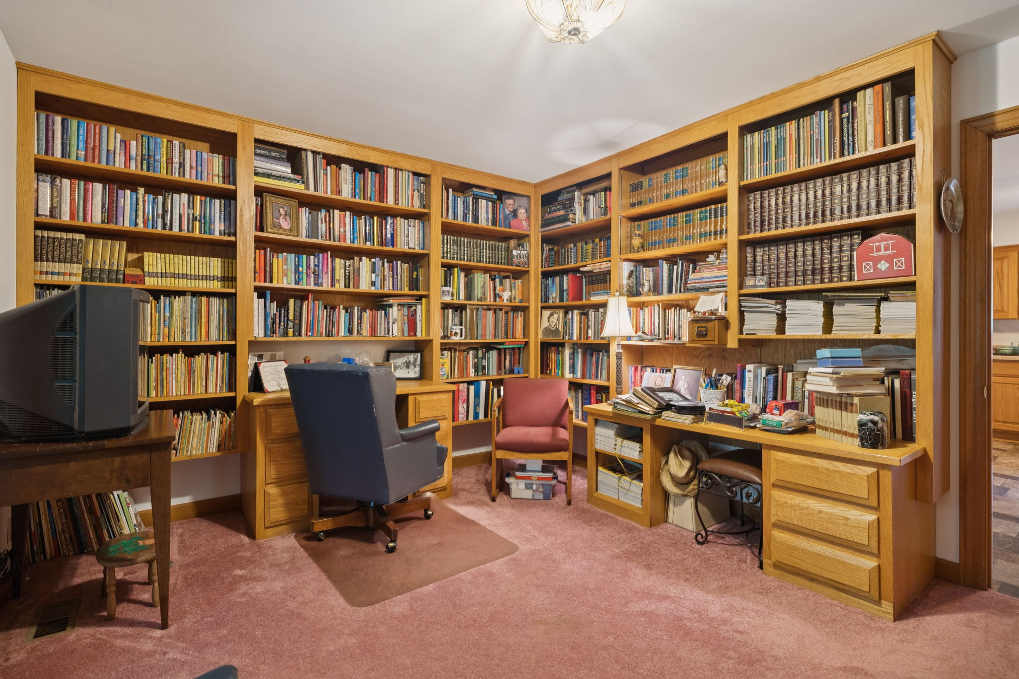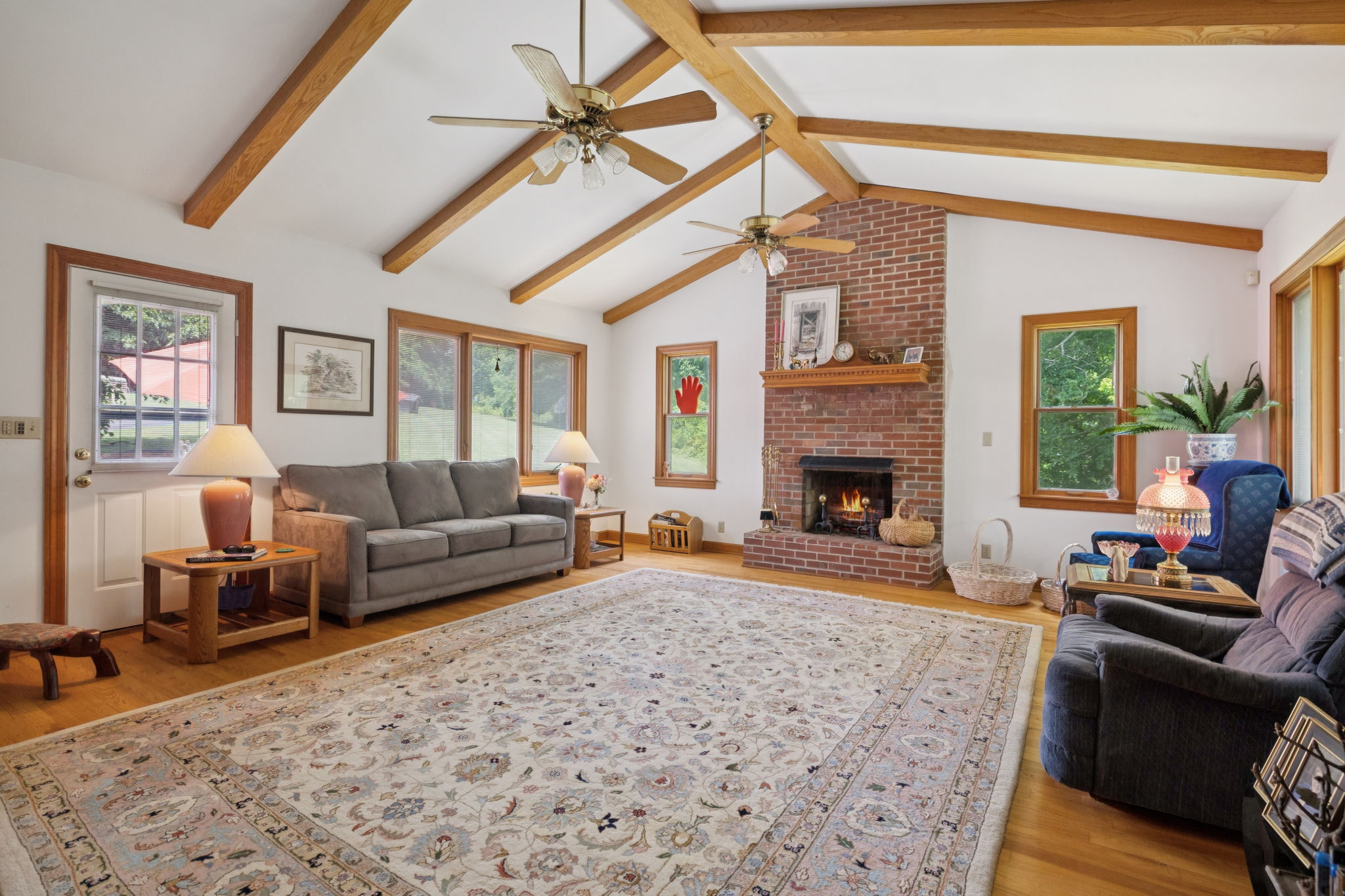 In the great room, vaulted ceilings with exposed wood beams soar above rich hardwood floors, while a full brick gas fireplace and wall of windows create a warm, open space ideal for gatherings or quiet relaxation. The adjacent library features built-in oak bookcases and opens to both the kitchen and sunroom offering a versatile nook for reading, working, or reflection.